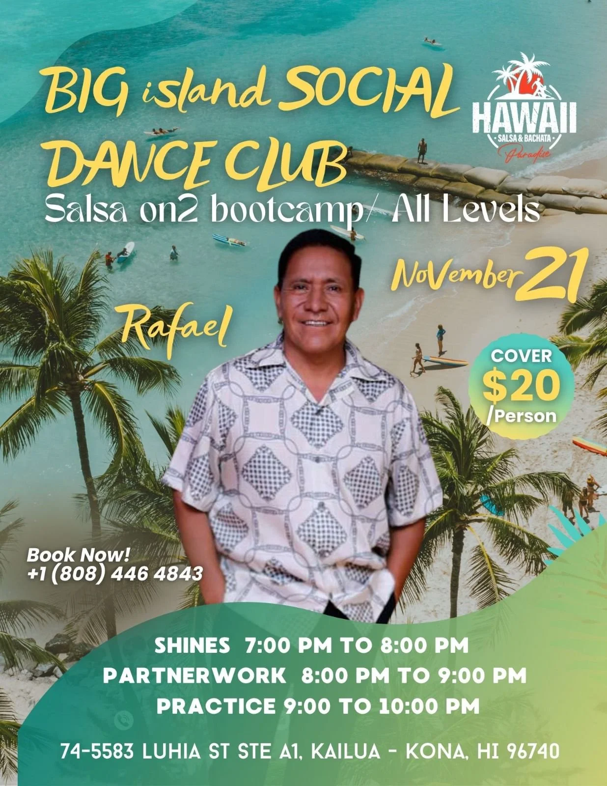 Join BIG ISLAND SOCIAL DANCE CLUB for an unforgettable Salsa On2 Bootcamp with the amazing Rafael — open to all levels, from absolute beginners to seasoned dancers.